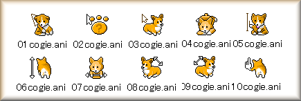 イギリス生まれのわんちゃん。日本の犬にそっくりで、ふさふさの毛とピンと立った耳が人気の犬です。えさ皿のアイコンがおまけで付いてますよ。コーギー・マウスカーソル